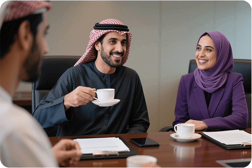 4-language real-time translation, Arabic/English transcription, cross-timezone calendar