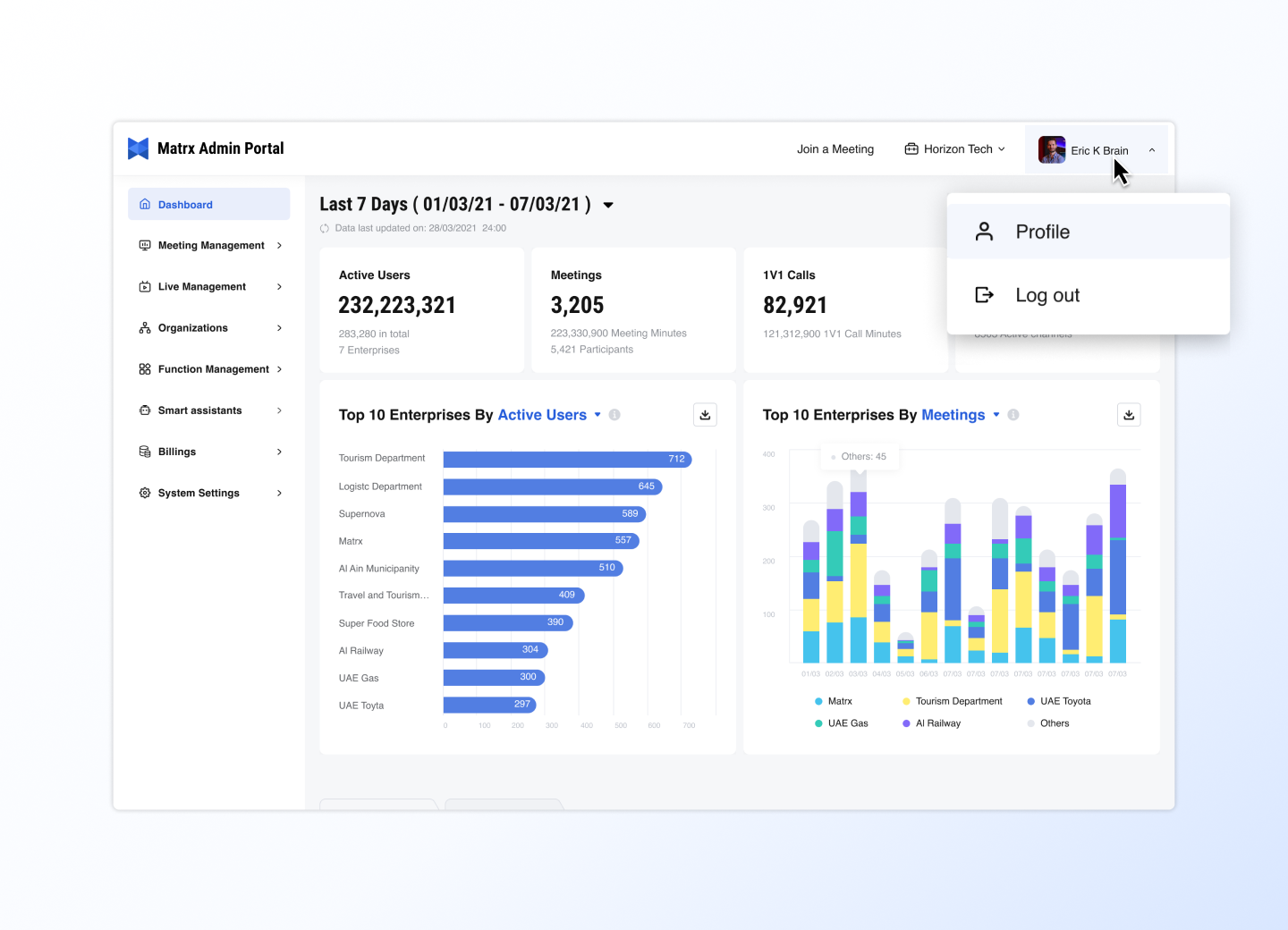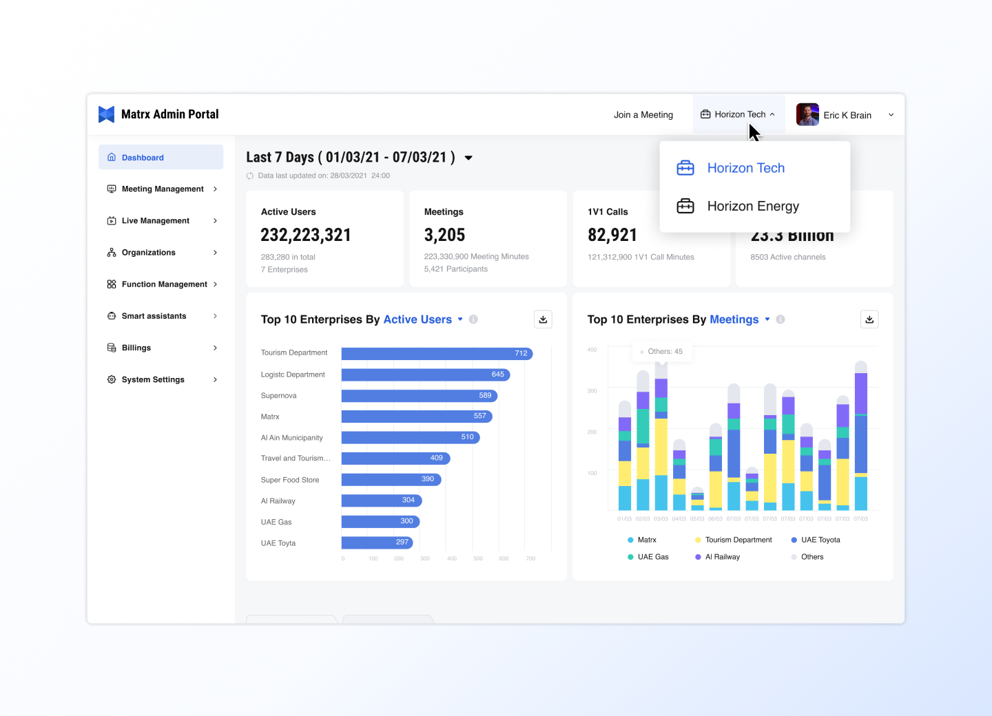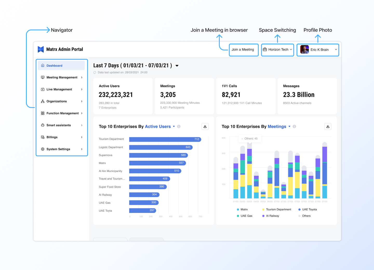 Matrx Admin Portal is an information collection and management center commonly used by enterprise administrators. Here, HR administrators can manage the organizational structure and members of the enterprise; IT administrators can manage all meetings and function configurations within the enterprise space; financial managers can also come here to view subscription bills, etc.