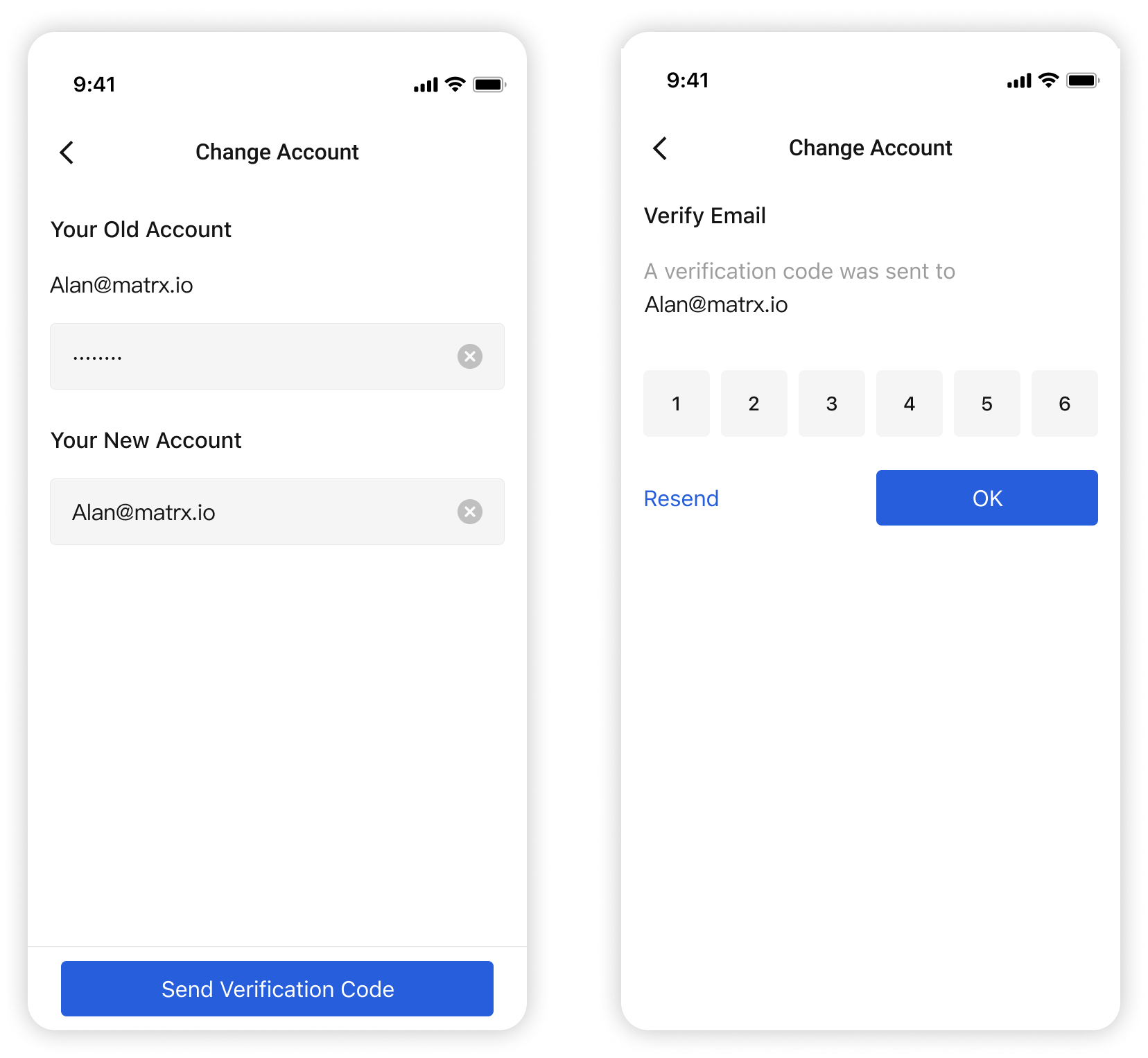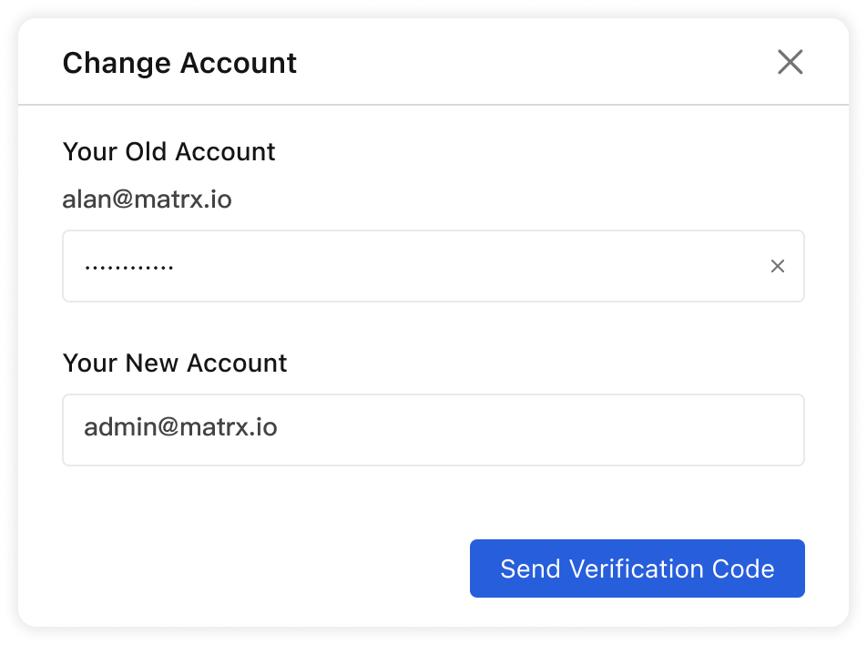 - Then input your old account, and your new one, and verify the email by verify the code Matrx sent you via email.