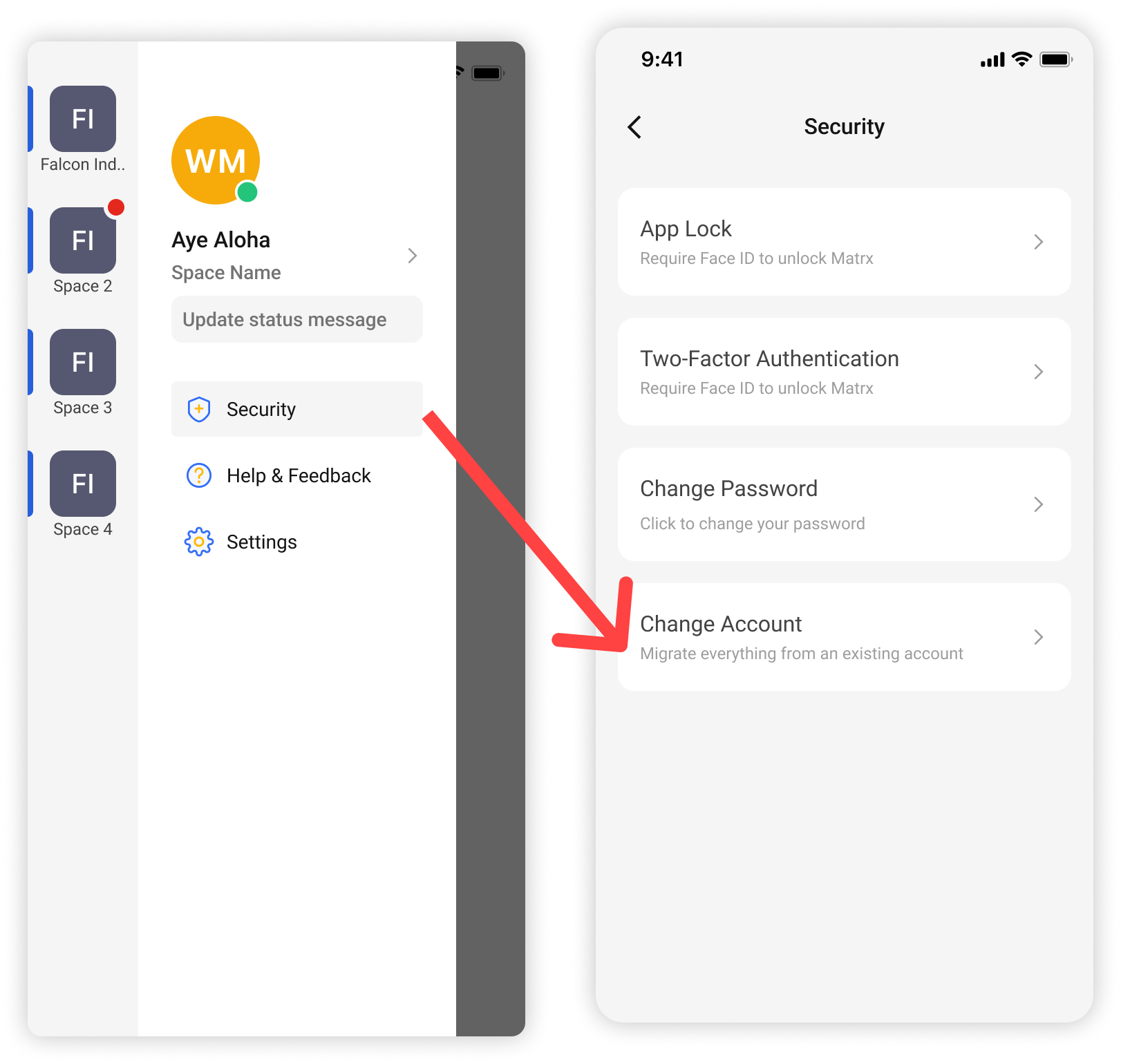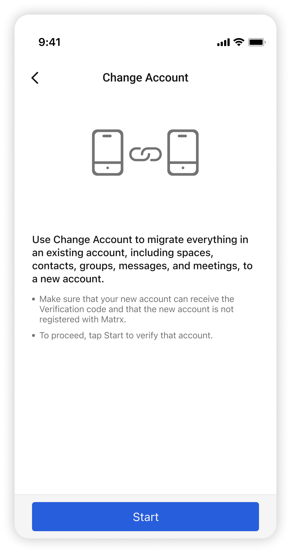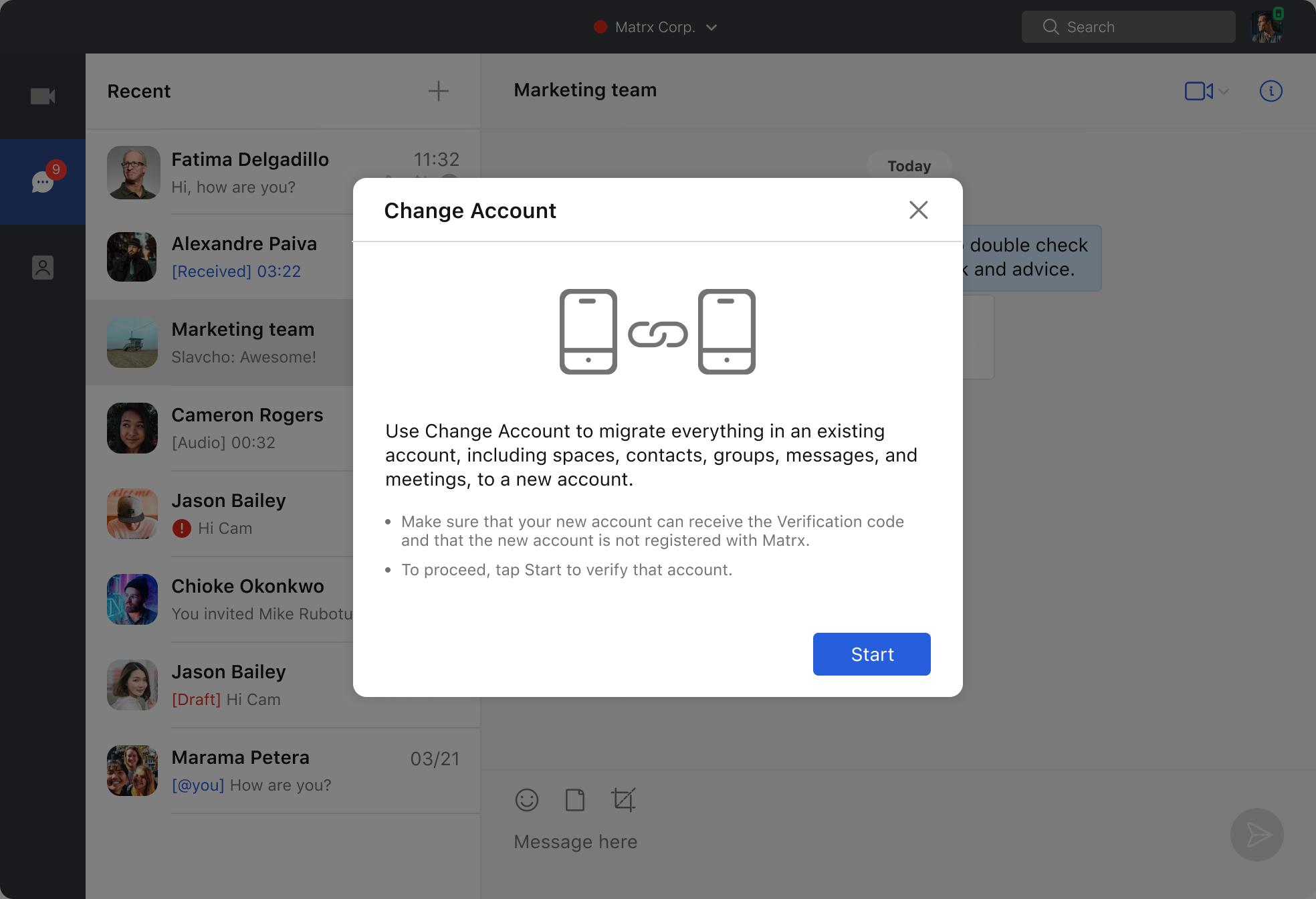- Change account will migrate everything in an existing account, including spaces, contacts, groups, messages, and meetings, to a new account.