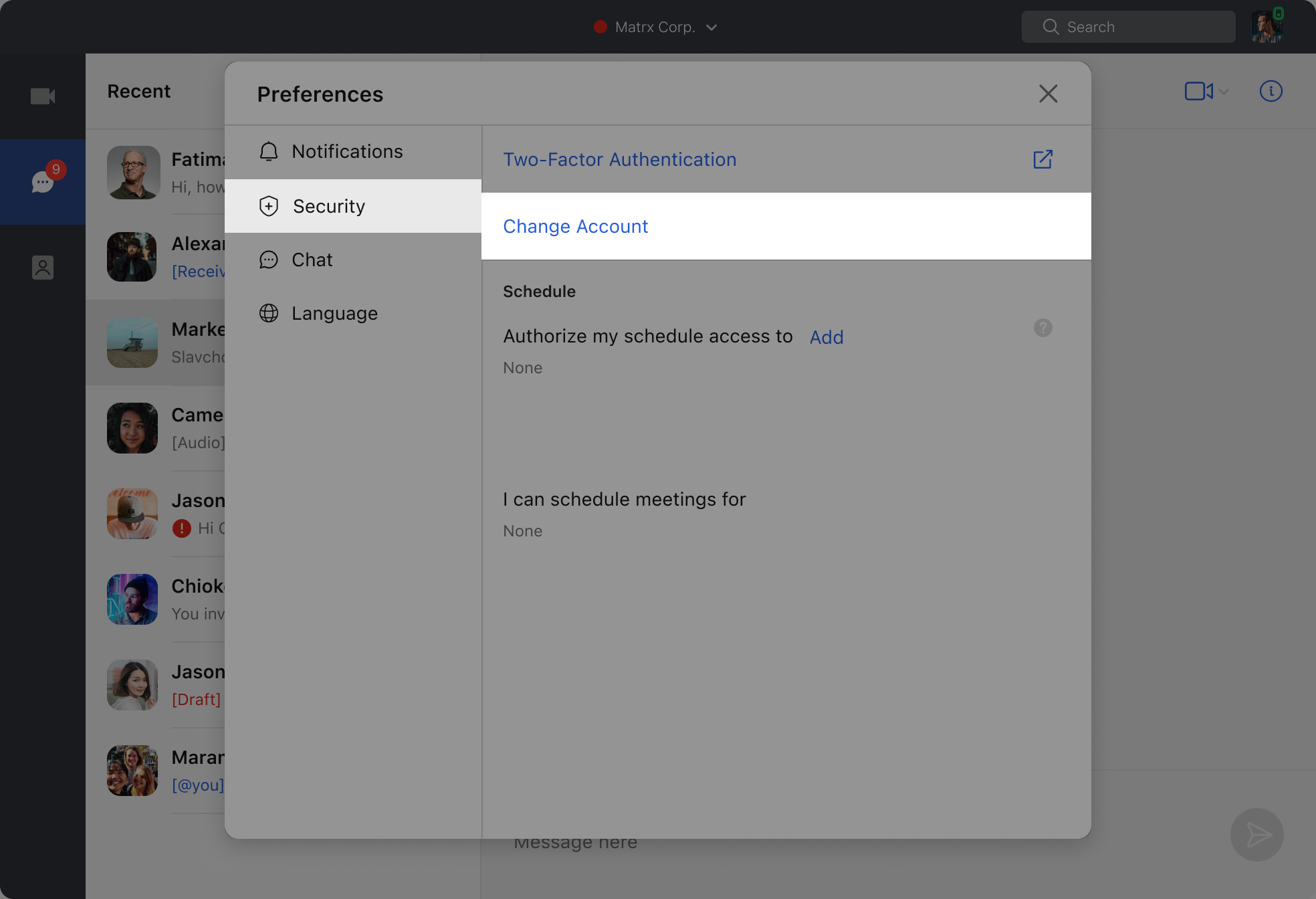- In Preferences pop-up, go to Security -> Change account