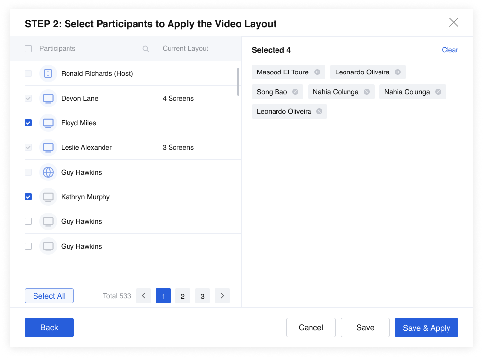- You can set different layouts for different groups of participants in one meeting. Therefore, you can apply the custom layout to selected participants and then set a different layout for another group of selected participants. You can apply the layout to all participants of a meeting as well.