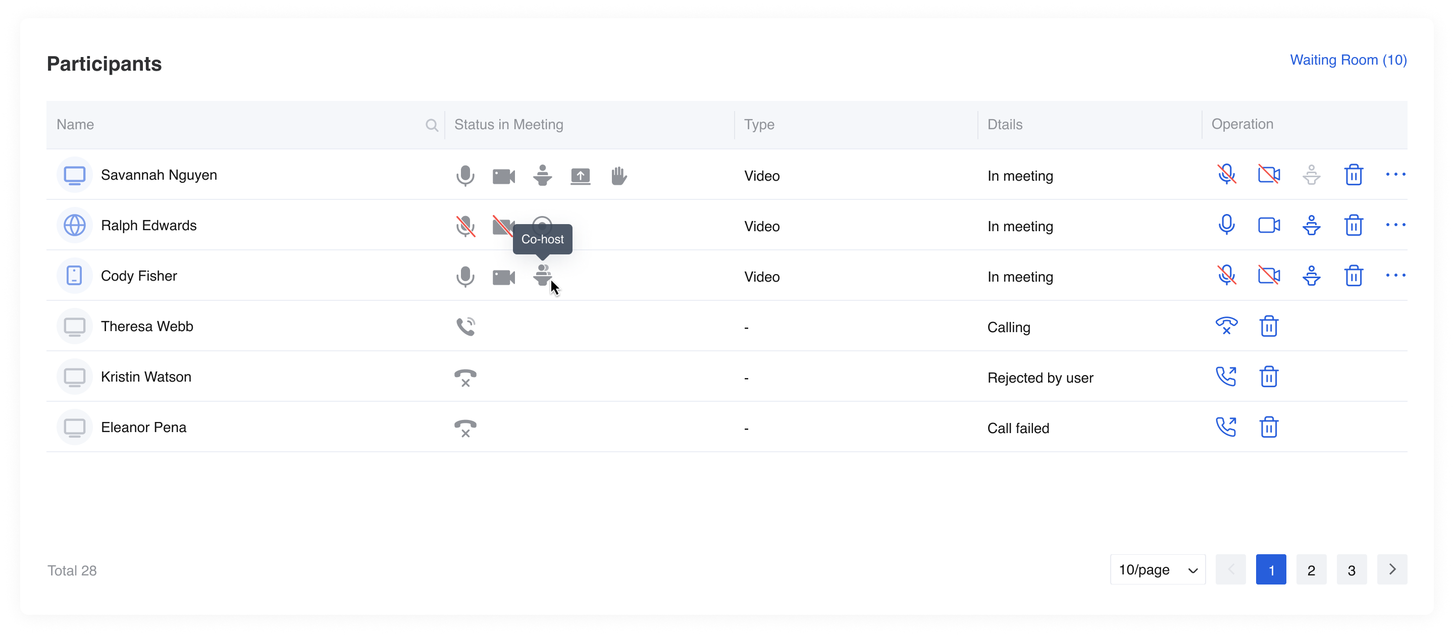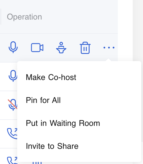In the participant list, you can see the status of every participant, whether they are the host, co-host, or not, and whether their microphones and cameras are on or off. Besides, you can manage if you want any participant to be muted or removed. You can manage the host in the meeting as well. The following are all the actions you can take from web meeting control.