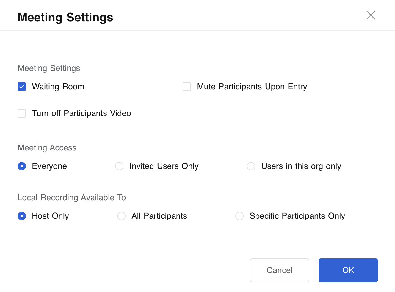 Click the Meeting Settings button, you can manage the join settings and local recording permissions.