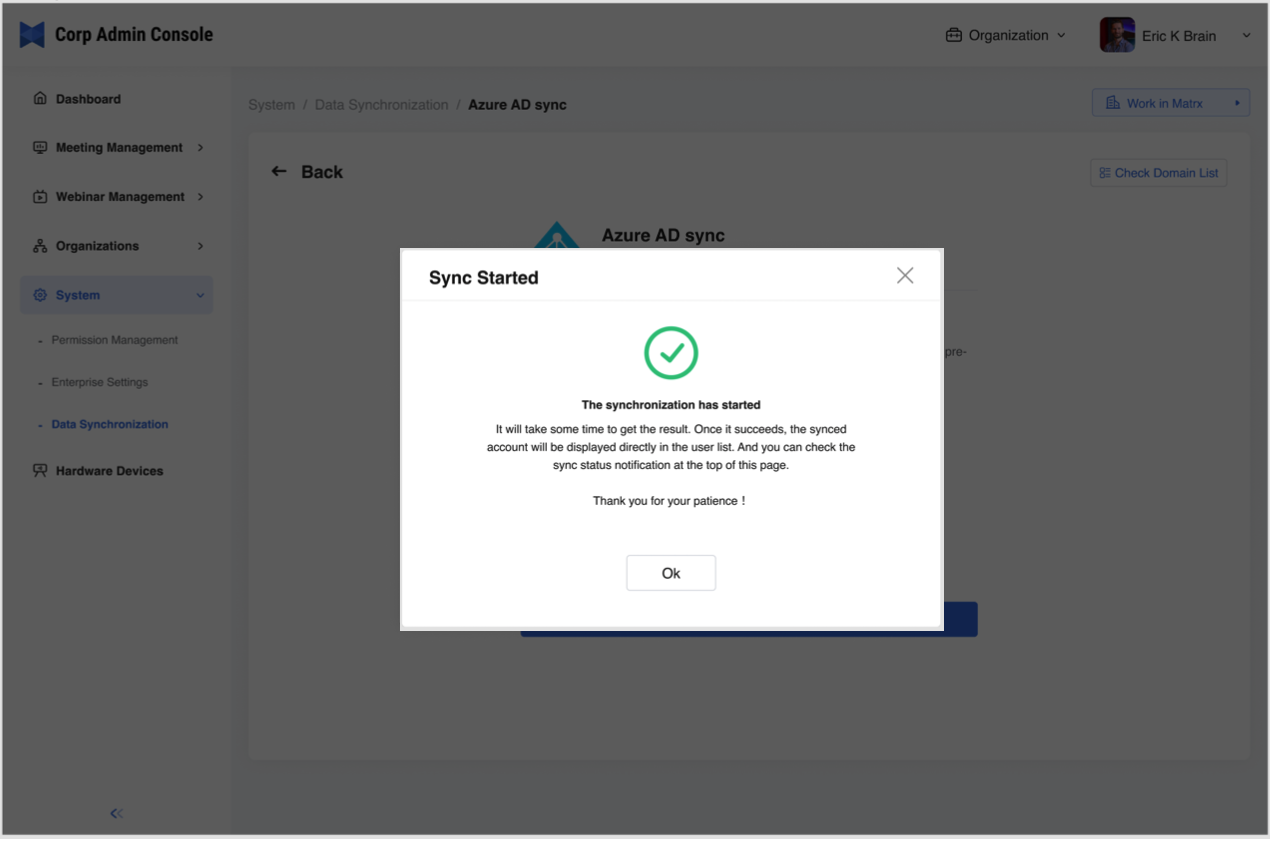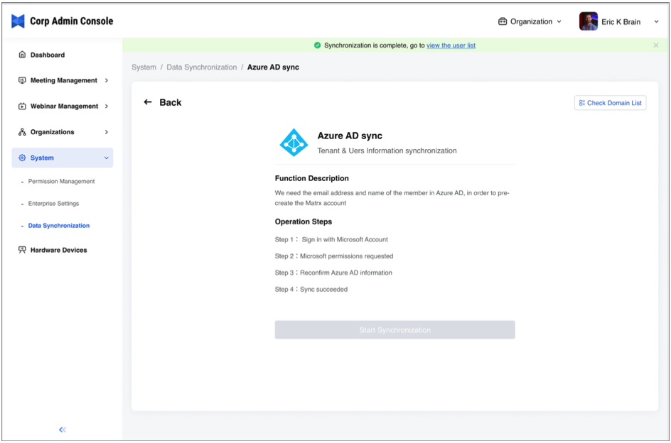 - After the synchronization is completed, you can click the prompt to view the user list. Also, the enterprise employees can use SSO to sign into Matrx with their Microsoft accounts now.
