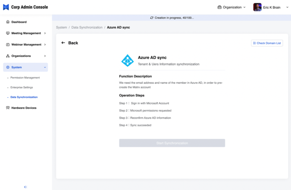 Matrx supports docking with the Azure AD system which could synchronize enterprise members to Matrx. It helps enterprise admins to create user accounts and manage the users at the admin portal in a more efficient and effortless way.