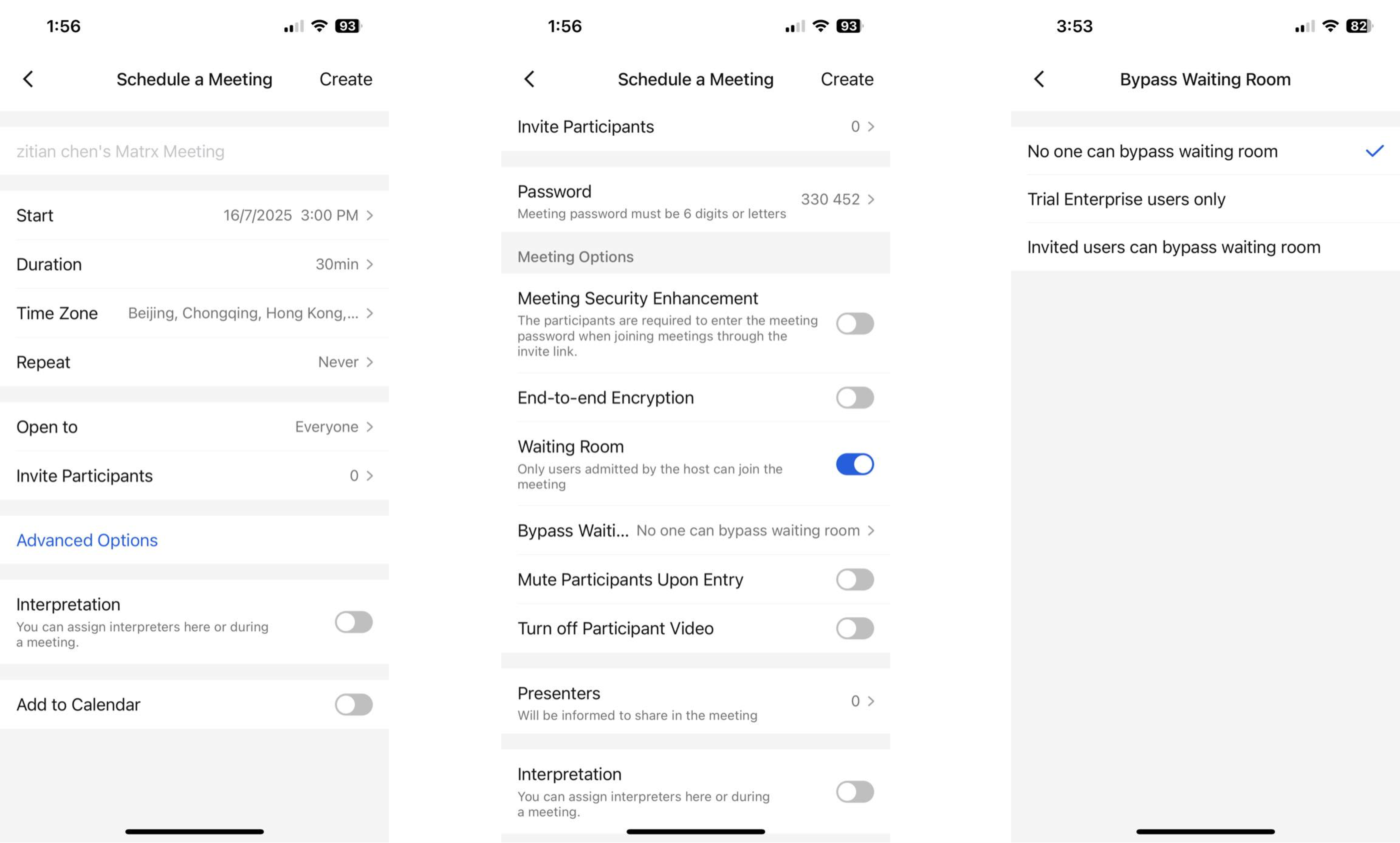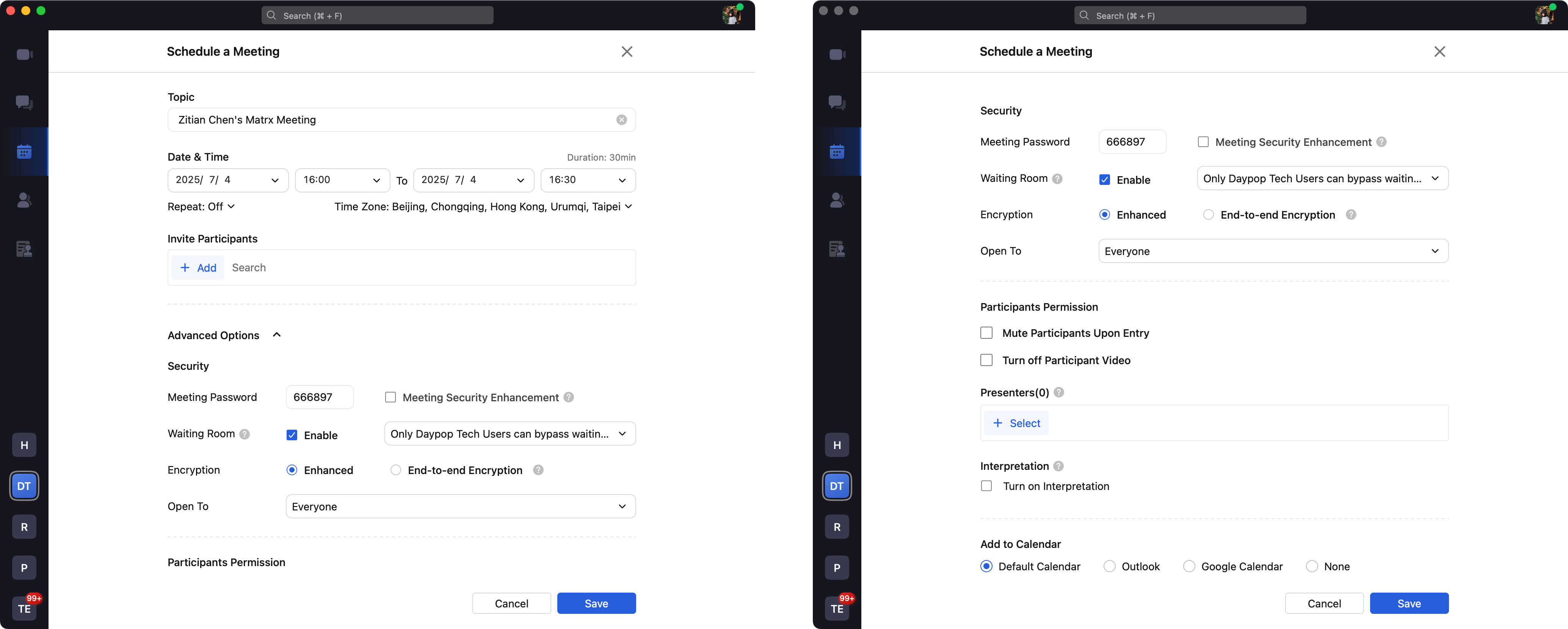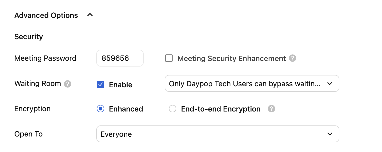 For meetings with a high level of security, you can set a meeting password, or set the waiting room, whether to turn on end-to-end encryption, and the meeting open range.
