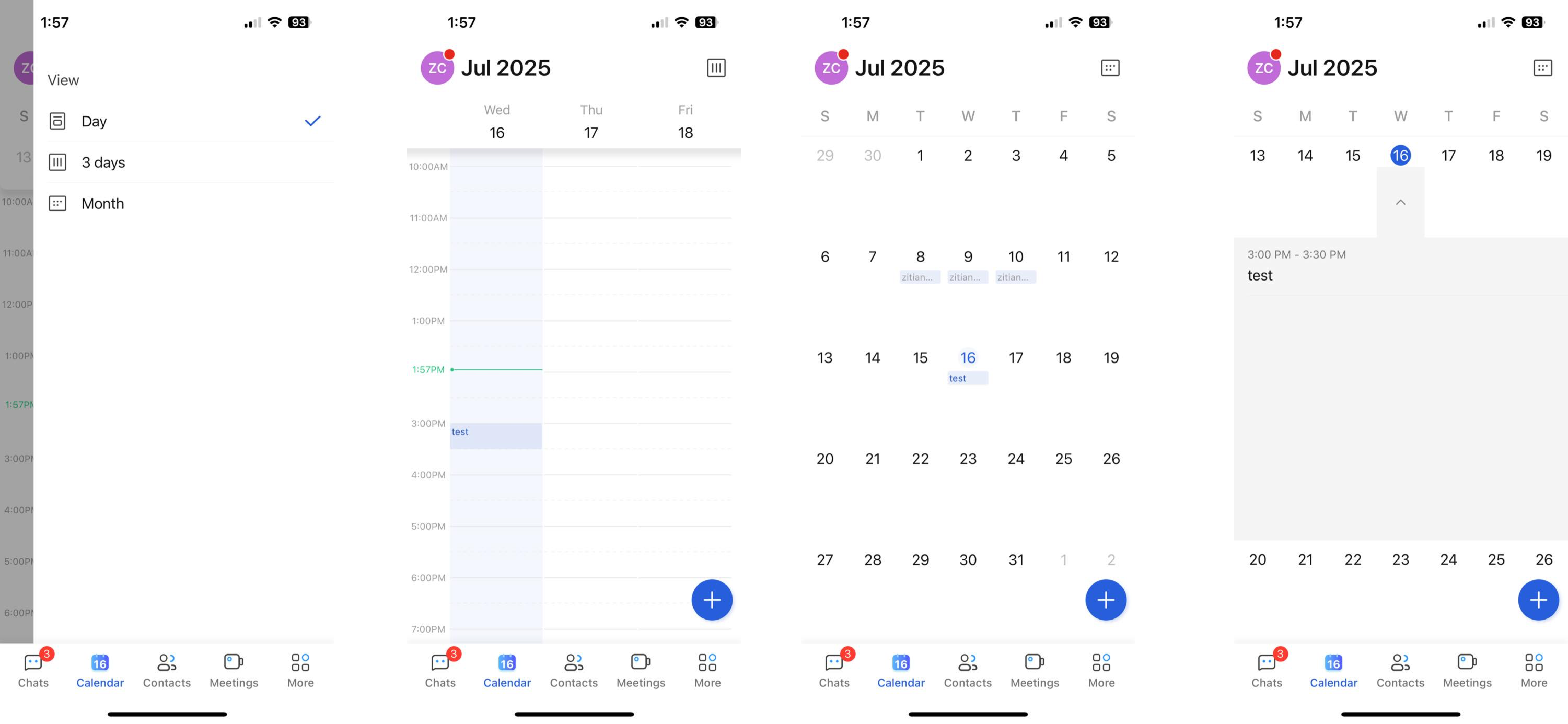Tap a time period in a day to quickly create a schedule for that day, and the schedule duration will be automatically selected to half an hour for you. You can also quickly add a calendar by using the Add icon in the lower right corner.