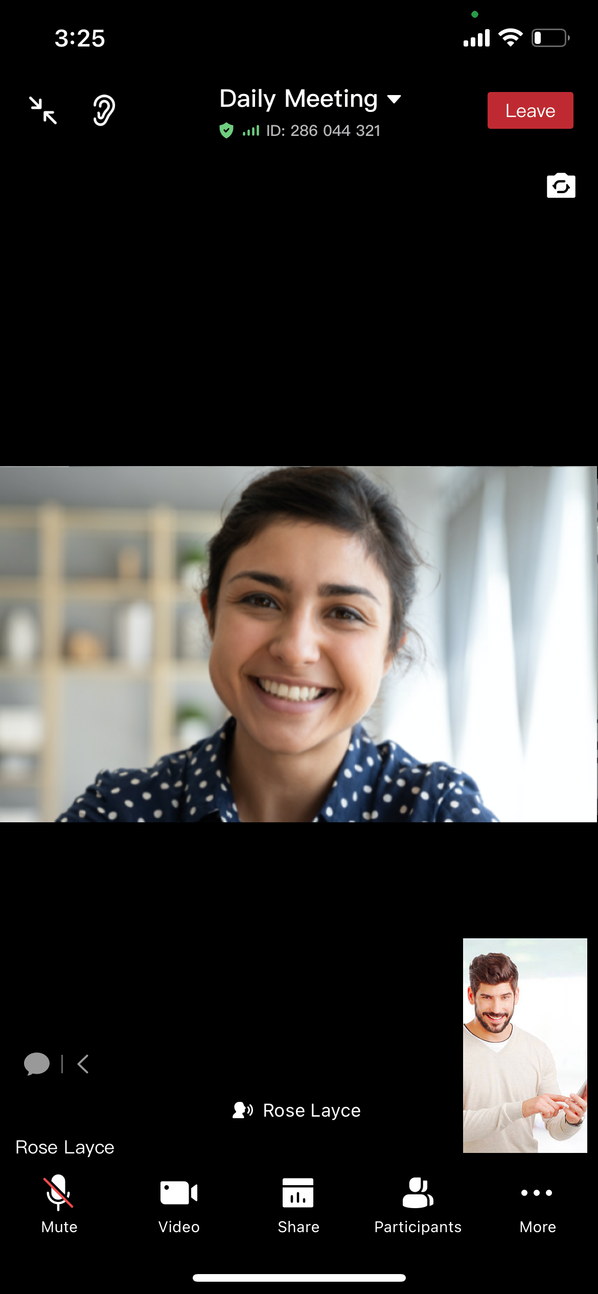 In PiP view mode, if no one is sharing in the meeting, then the large pane shows the participant who is talking, while the small pane at the down right corner shows the participant's own view.