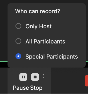- When "Specific participants only" is selected, the host can go to the Participants list, choose the participant, and click "Allow recording" to enable that participant to record in the meeting.