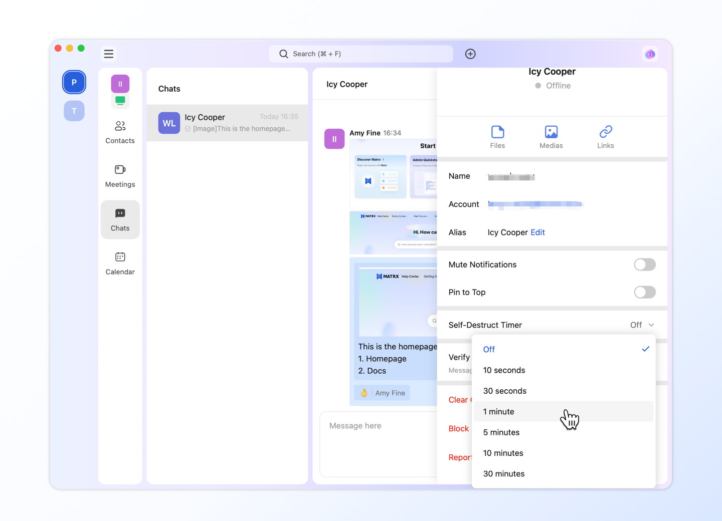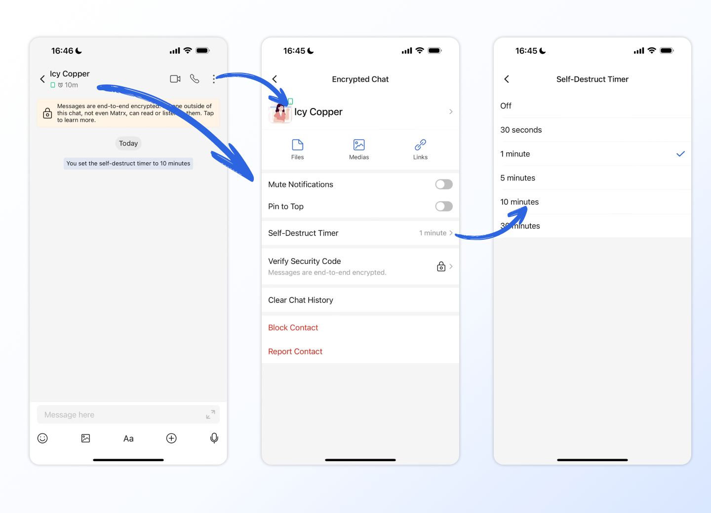 Self-destructing message is available on Matrx to further enhance messaging security. You can set a Self-Destruct Timer in 1-on-1 chats. As soon as the time runs out, the sent and received messages would disappear from both parties' devices.