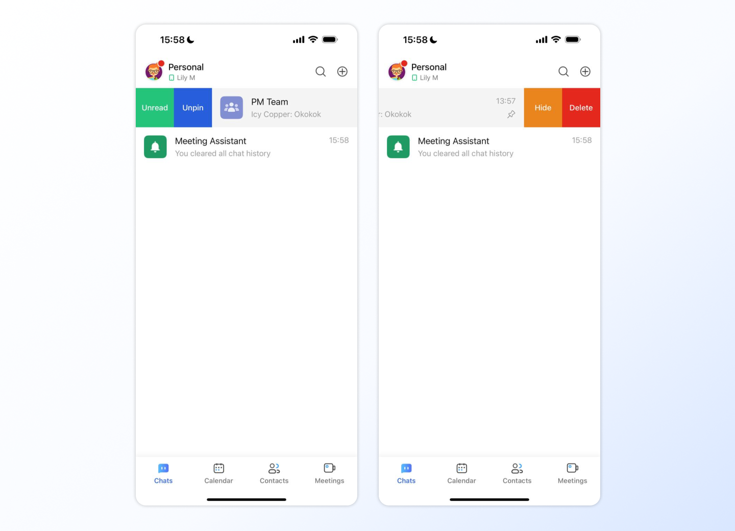 Swipe the chat to the left and tap the orange Hide button. If the chat is hidden, it will disappear from the chat list, but the historical messages in the chat won't be cleared.