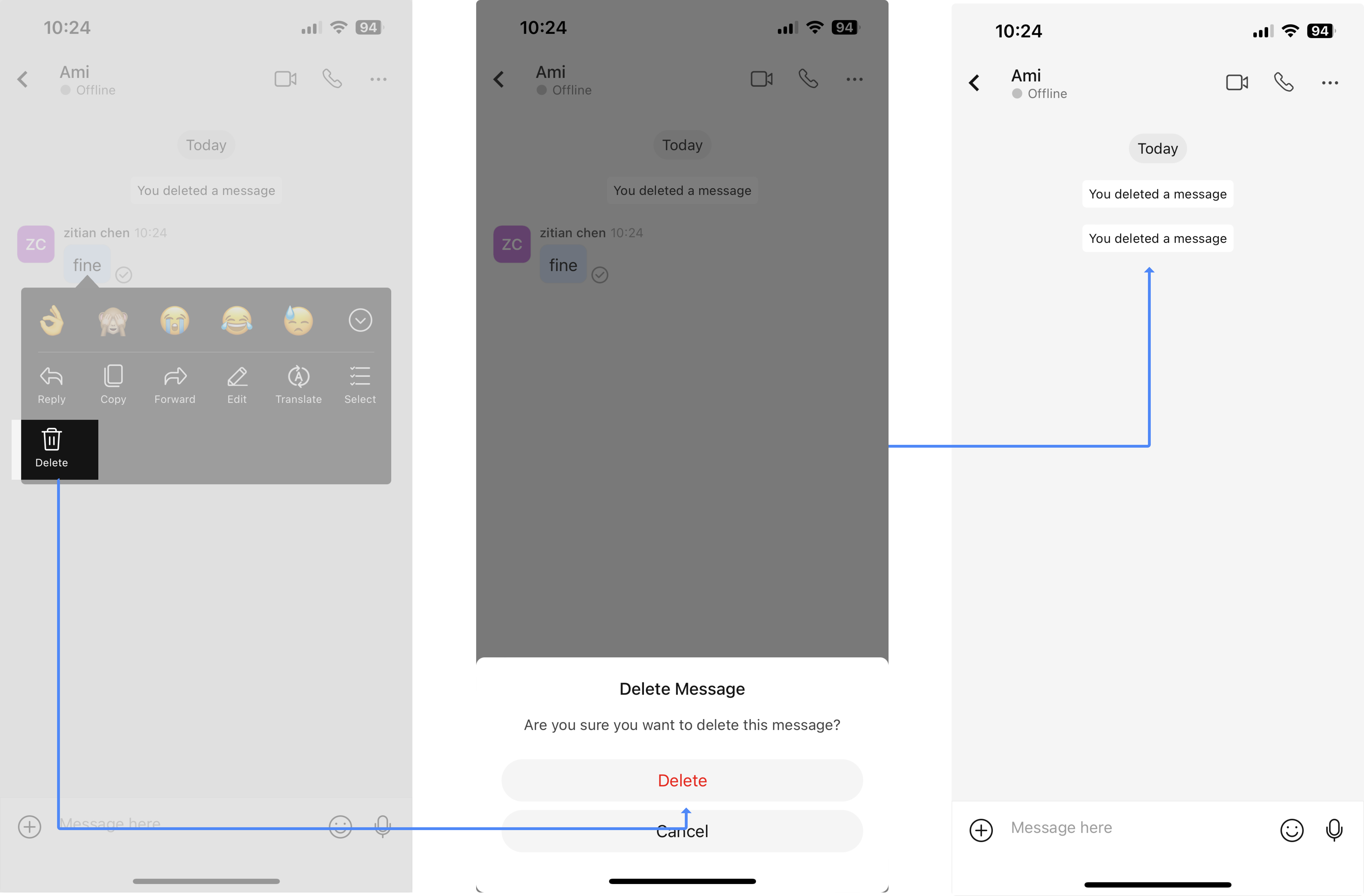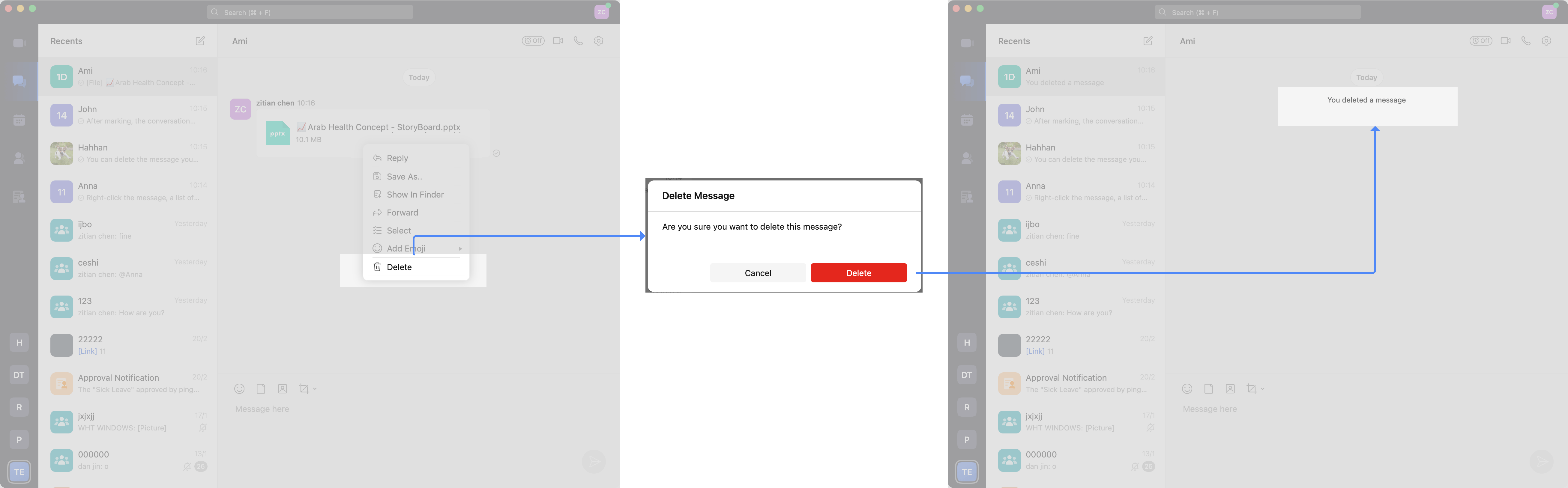 After Delete, the original location of the message will display [Sender Name] Deleted a message.