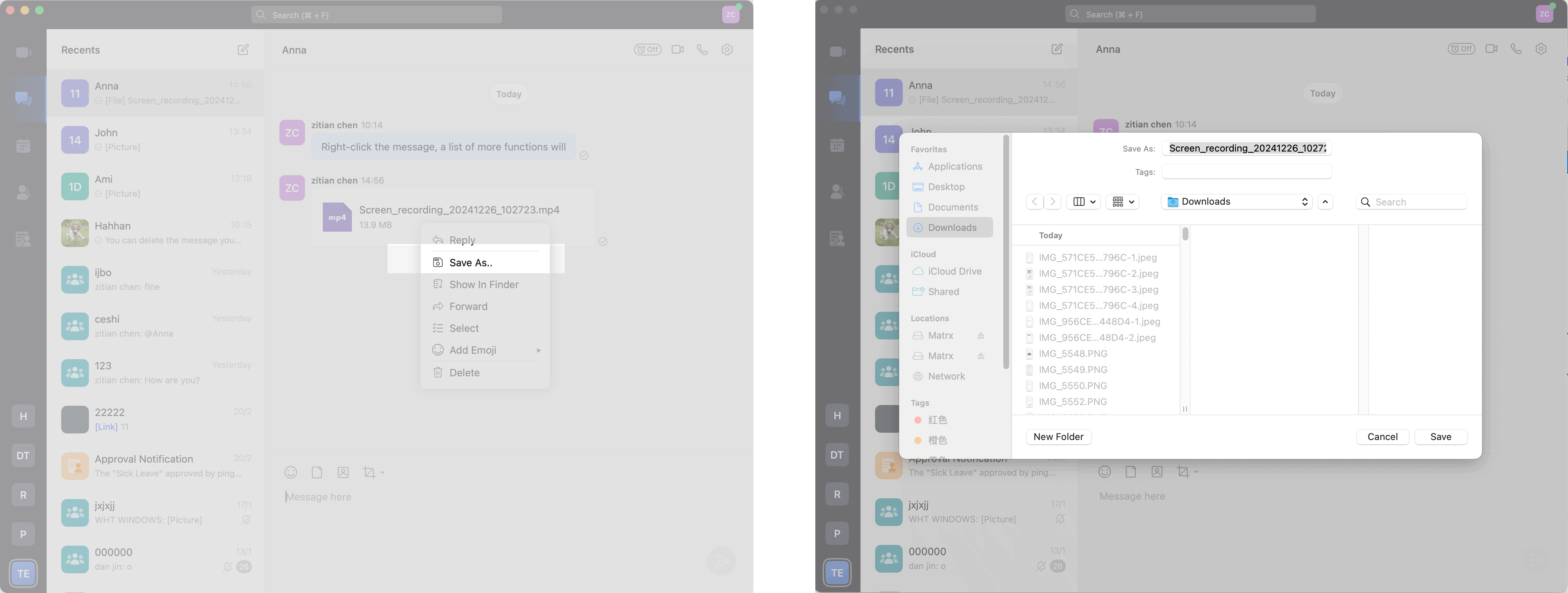 Right-click the video and select Save as in the More Functions list. Select the location where you want to save the video file and save the video locally.