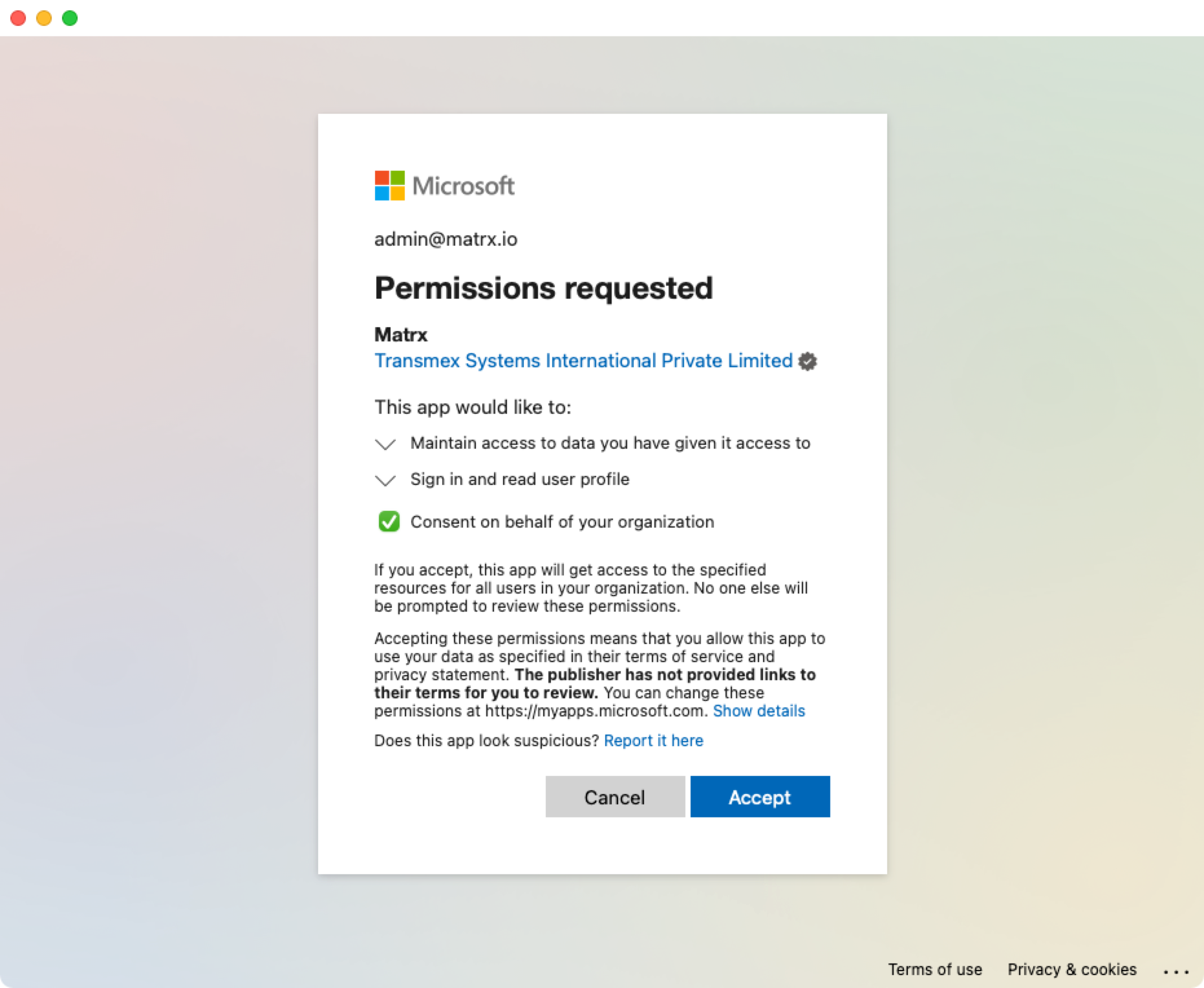 Enable the option "Consent on behalf of your organization" and then click Accept (for the first time only).